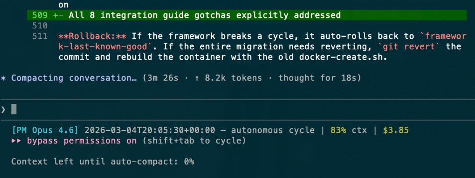 Claude Code has a limit on its context window. This means that every so often it looks at the whole conversation history and summarizes it. I’ve read reports of folks who can happily make it through context compaction, but I’ve found that performance is almost always significantly degraded afterwards. It’s not uncommon for Claude to specifically disregard my most recent command during compaction, like “write this PR and stop” or “verify this PR using [tools] before delivering it”. I’ve somewhat mitigated this by reinjecting my Claude.md instructions at the compaction hook, but compaction is still dangerous so I prefer to reset sessions when the context runs out. In my experience, once Claude starts making mistakes, it will keep getting worse.