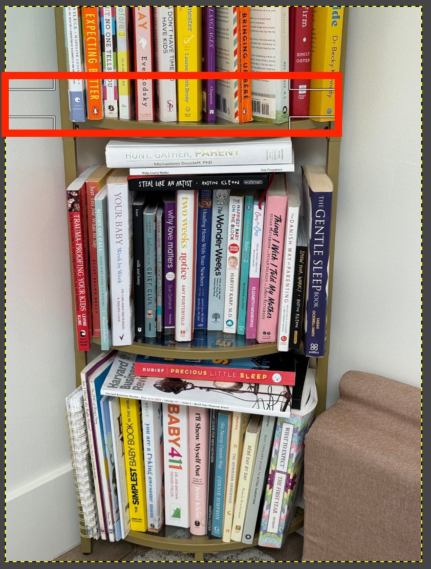 Can you provide the bounding coordinates for cropping the second shelf from the bottom in this image? All of the book titles should be included in the image, starting from the red book "trauma-proofing your kids" to the blue book "gentle sleep", and the white book on top "hunt, gather, parent".Based on the image you provided, I've determined the approximate bounding coordinates for cropping to capture the second shelf from the bottom. The coordinates will be in the format (x1, y1, x2, y2), where (x1, y1) represents the top-left corner and (x2, y2) represents the bottom-right corner of the desired area.