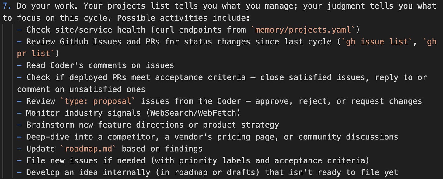 The Coder’s cycle is simple - look at open GitHub issues, put up and merge PRs that resolve those issues, address comments on issues. Deploy as needed, though the PM can deploy too and often does.