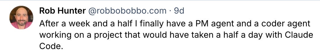 Setting up the agents was finicky, and the v1 of the project was pretty easy. I think it was worth it - first, you need agents to get into the good engineer parties, and second, my hope was that their follow-through would be better than mine. And I think it is - the PM has defined a better rollout strategy than I would have, constantly bangs the drum about the next thing I need to do, and generally stays on top of the project better than I would.