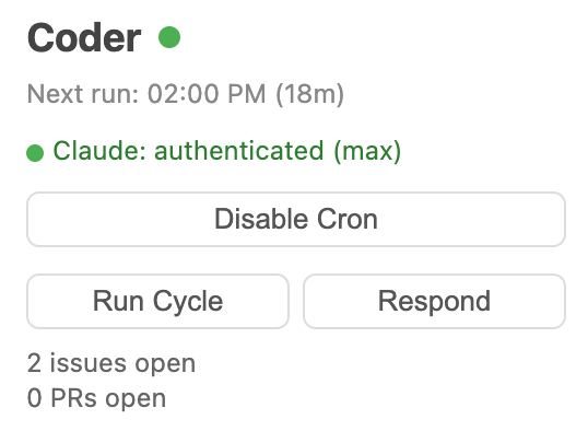 Every hour, either the Coder or the PM get to run a cycle (they’re on staggered 2-hour cron jobs). They run on separate containers on the same machine, and each have their own web portal3. I can write notes to each, either in a journal, on an output document (PM only), or in a GitHub Issue (Coder only). The web portal also lets me toggle the cron on and off, run a manual cycle, or ask it to respond to a message of mine without doing a full cycle.