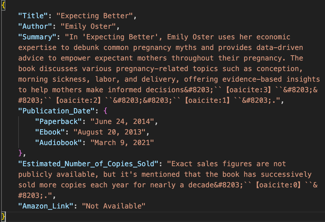 For the following book, please return a brief summary, the date published, and the name of the author: "Expecting Better"I read the book and really liked it. Does Emily Oster actively post related content online, maybe to social media, a website, an email newsletter, or a podcast? If so, please provide links to those sources. For the first overview question, both web and non-web responded reasonably. The cool thing about the web response is that it responded with source links, which makes it a little easier to verify.