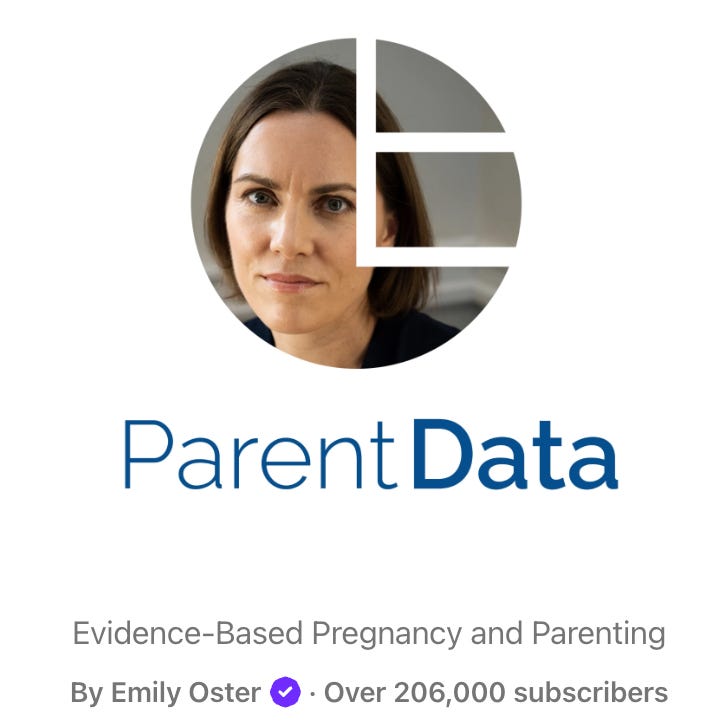 Newsletter: Emily Oster has been known to write for various media outlets and has also started a newsletter on Substack called "ParentData". You can check it out and subscribe to it at [url]. [Rob: Substack automatically turns this link into a widget if I paste it bare]