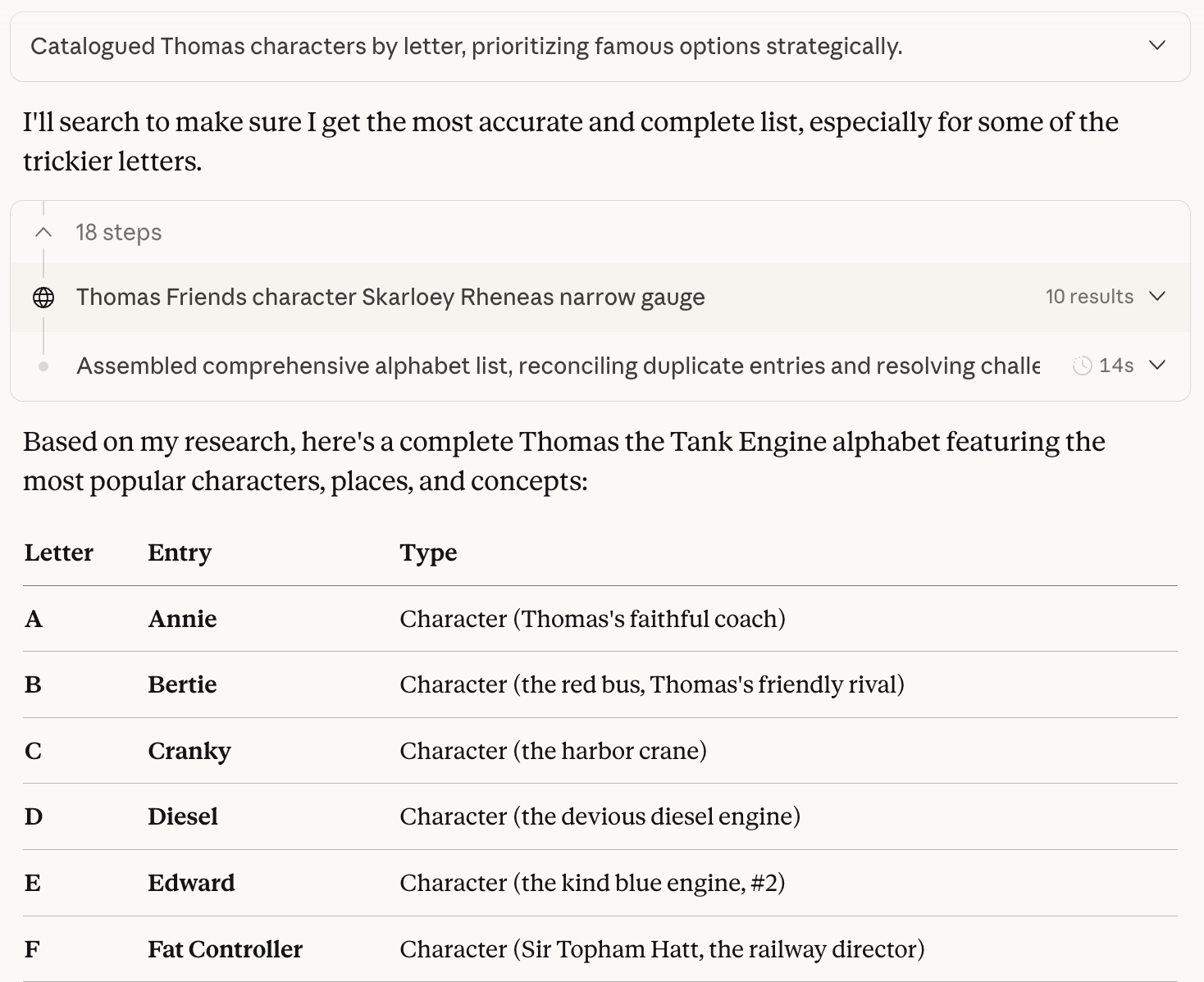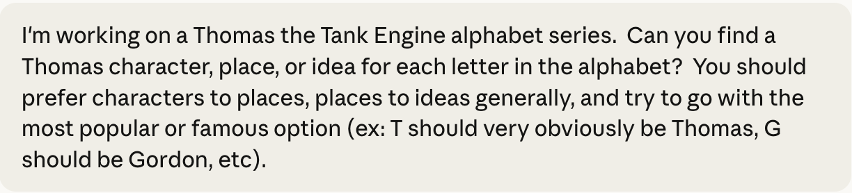 Sometimes “building the spec” involves some extra legwork - researching an idea or a technology, or in this case testing if Claude would be willing to help me on a project that involves copyrighted material. It was willing to brainstorm “A is for Annie”, but not willing to generate images.