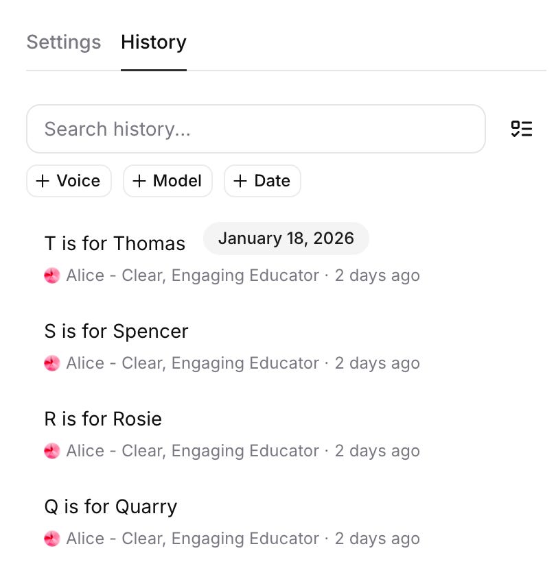 I didn’t want to actually record audio, and Claude suggested ElevenLabs. I’d heard of them but never used them before - it was free and easy. Pick a voice, type “T is for Thomas” into the box, generate, test, download. Maybe it took me 10 minutes, I bet I could have gotten Claude to do it for me if I was paying for a developer account. It’s not perfect, but I think it’s better than OSX’ built in text to speech.