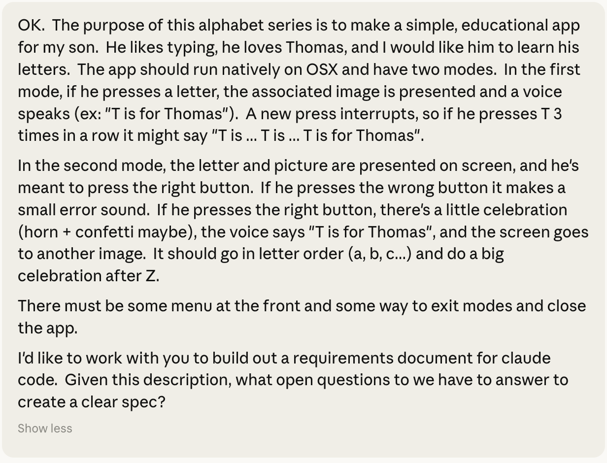 Claude responded with a list of 29 questions, with topics ranging from Audio and Visual Design to Gameplay. It even asked how old Charlie is to “calibrate complexity, text size, feedback timing”, who knows if it really used that information. I copied the questions into a Google Doc, answered them inline, and sent the answers back. Then I asked for the spec back as a downloadable spec.md file. This is just a markdown file that I’m going to put in the project directory.