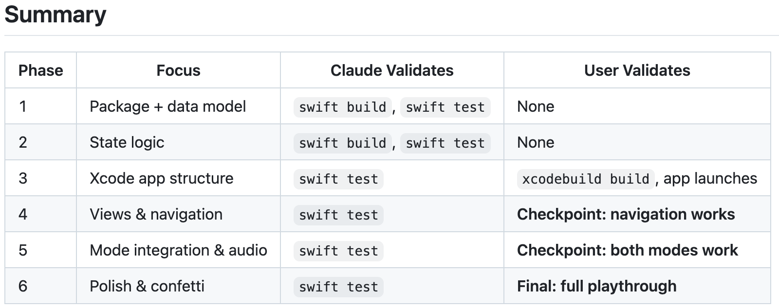 There are folks online who talk about handing a spec to Claude, having it do the whole thing in a single shot, and being happy with the result. I have never had this experience - I prefer shorter milestones with clear verification steps. This project was just small enough that it might have worked, but it’s not my process. We agreed to the plan and it started developing phases 1-3.